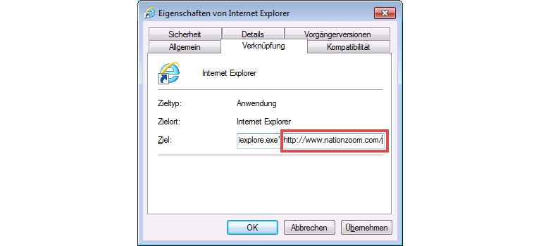 Für alle Verknüpfungen zum Internet Explorer – zum Beispiel auf dem Desktop, in der Schnellstartleiste, in der Programme-Leiste usw. – das Verknüpfungsziel kontrollieren. Dazu mit einem Rechtsklick mit der Maus auf das IE-Icon klicken, im Aufklappmenü „Eigenschaften“ anwählen und in den Reiter „Verknüpfung“ wechseln.